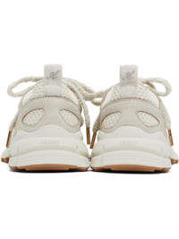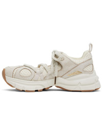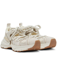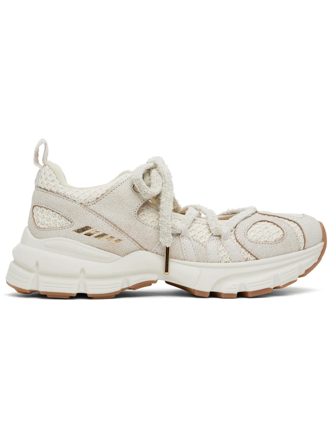 Low-top textured woven recycled polyester Mary Jane-style sneakers in off-white. · Handcrafted · Cracked leather trim throughout · Lace-up closure · Padded collar · Logo-embroidered pull-loop at heel collar · Gold-tone stamp at sides · Recycled jersey lining · Logo embossed at midsole · Treaded rubber sole Supplier color: Off white/Off white Upper: leather, textile. Sole: rubber. Made in Portugal 251307F128024