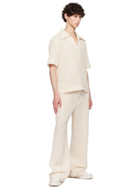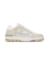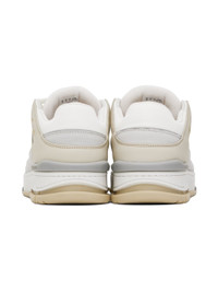 Handcrafted low-top paneled LWG-certified buffed leather and recycled polyester canvas sneakers in white and beige. · Perforated detailing throughout · Lace-up closure · Logo patch at padded tongue · Padded collar · Logo stamp at outer side · TPU trim at heel counter · Recycled mesh and faux-suede lining · Logo embossed at textured rubber midsole · Treaded thermoplastic rubber sole Supplier color: Cremino/White Upper: leather, textile. Sole: thermoplastic rubber. Made in Portugal 242307M237055