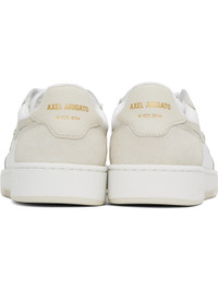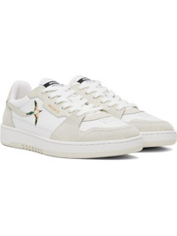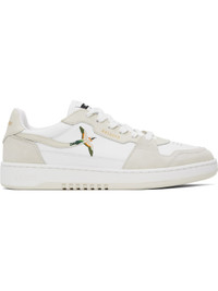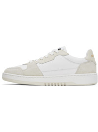 Handcrafted low-top buffed leather, suede, and recycled canvas sneakers in white and beige. · Perforated detailing at toe · Lace-up closure · Logo patch at padded tongue · Padded collar · Logo stamp at outer side and heel tab · Embroidered graphic at outer side · Recycled mesh lining · Logo embossed at crepe rubber midsole · Treaded rubber sole Supplier color: White/Off white Upper: leather, textile. Sole: rubber. Made in Portugal 251307M237059