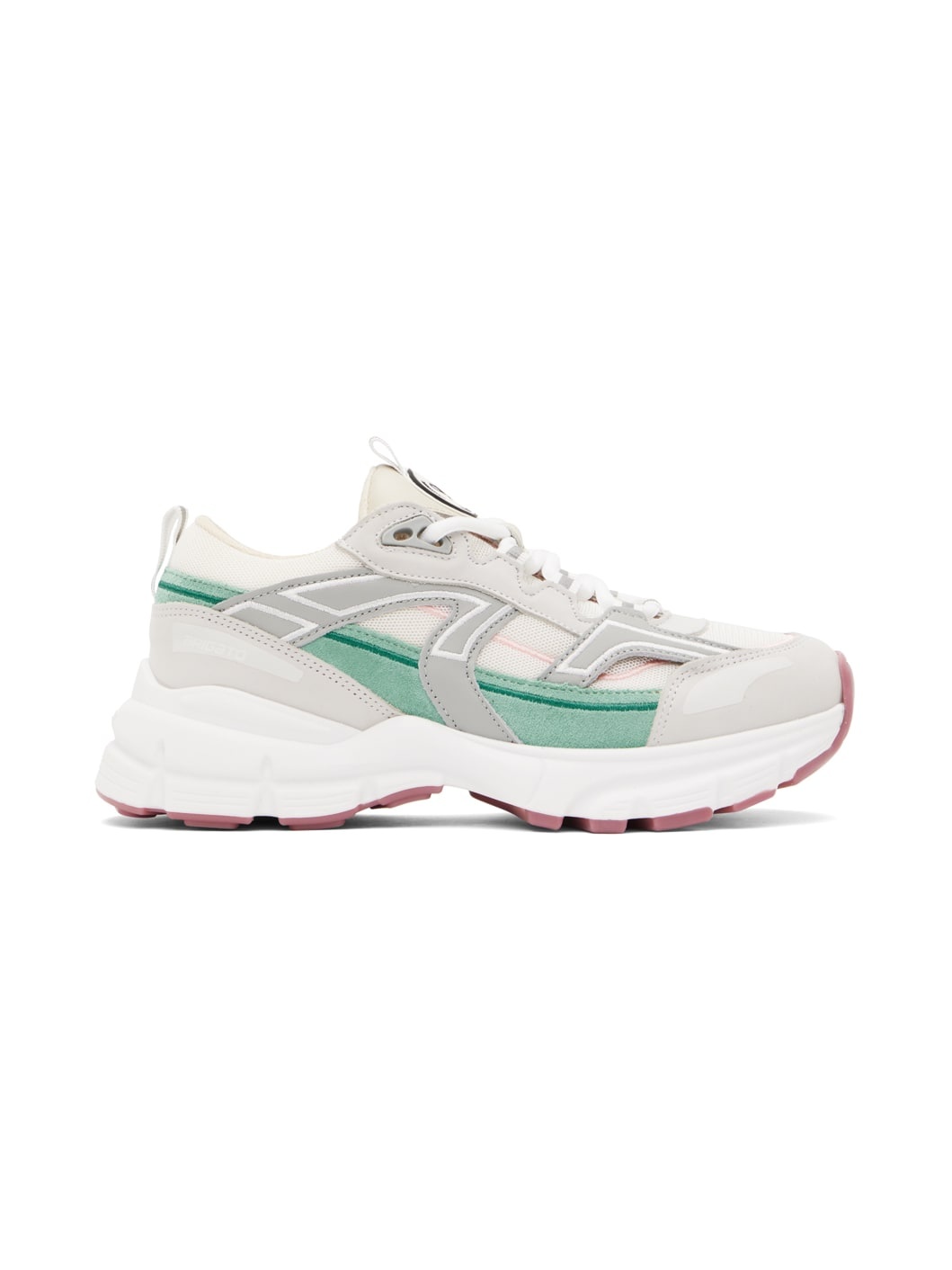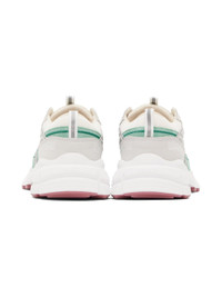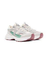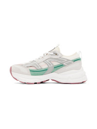 Handcrafted low-top paneled suede and mesh sneakers in white, blue, and pink. Reflective trim bonded throughout. · Lace-up closure · Rubberized logo patch at tongue · Pull-loop at padded tongue and collar · Logo bonded at outer side · Removable padded footbed · Mesh lining · Treaded rubber sole Supplier color: White/Dusty mint Upper: textile, leather. Sole: rubber. Made in Portugal 232307F128010