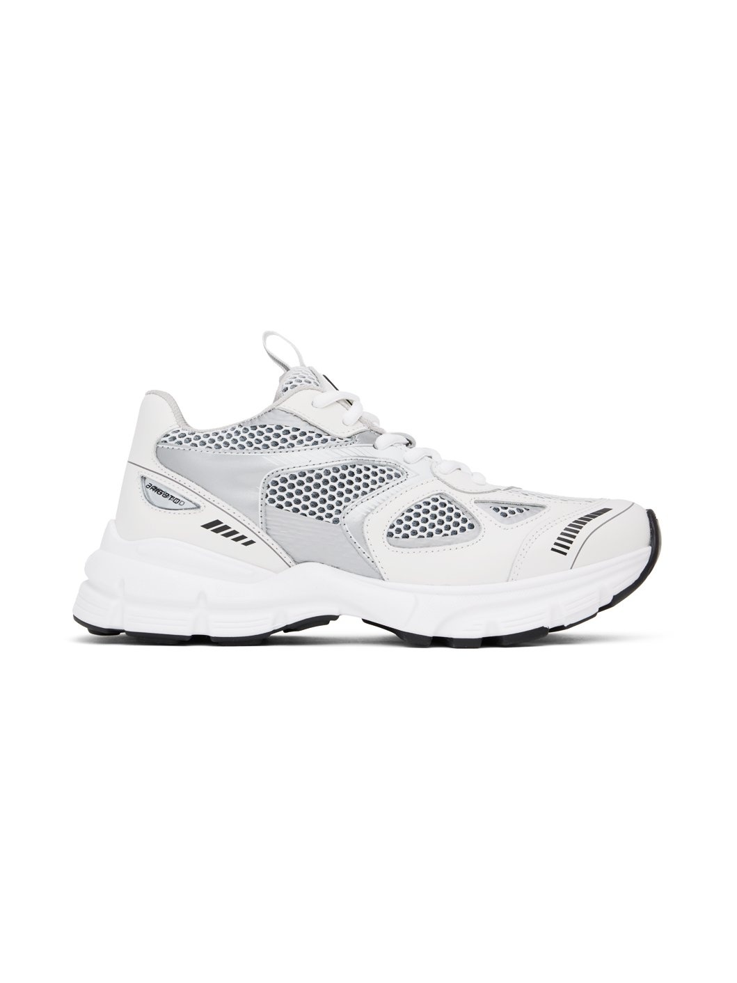 Handcrafted low-top LWG-certified buffed leather and honeycomb mesh sneakers in white and silver tone. · Bonded trim throughout · Lace-up closure · Reflective pull-loop at tongue · Rubberized logo patch at tongue · Padded tongue and collar · Rubberized logo applique at outer side · Logo embossed at heel counter · Mesh and faux-suede lining · Sculptural treaded thermoplastic rubber sole Supplier color: White/Silver Upper: leather, textile. Sole: thermoplastic rubber. Made in Portugal 242307F128021