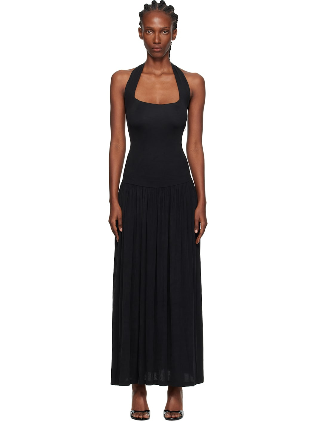 Stretch cupro rubbed jersey maxi dress. · Square neck · Gathering at dropped waist · Fixed halter strap · Concealed zip closure at side · Low back · Unlined Supplier color: Midnight 96% cupro, 4% elastane. Made in Portugal 252188F055003