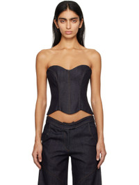 Non-stretch denim top. Boning throughout. · Sweetheart neck · Curved hem · Zip closure at back · Full plain-woven cotton lining · Contrast stitching in tan Supplier color: Denim 100% cotton. Made in Georgia 241188F111012