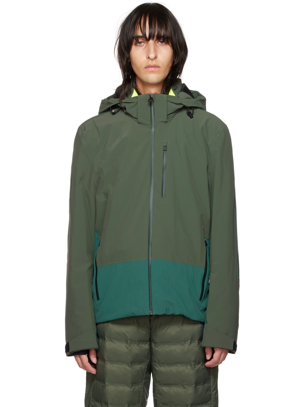 Primaloft®-insulated stretch nylon taffeta jacket. · Paneled construction · Drawstring at logo-bonded detachable hood · Stand collar · Zip closure · Zip pockets · Concealed drawstring at layered hem · Zip gusset at side seams · Zip pocket at cuff · Velcro tab at cuffs · Logo bonded at back · Patch pockets and zip pocket at interior · Full stretch jersey and mesh lining Supplier color: Radium green/Multi Body: 86% polyamide, 14% elastane. Fill: 100% polyester. Lining: 56% polyamide, 38% polyester, 6% elastane. Made in Slovakia (Slovak Republic) 222865M180001