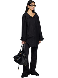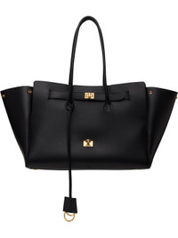 Buffed calfskin top handle bag in black. · Detachable key ring at rolled carry handles · Patch pocket at face · Straps and turn-lock fastenings at face · Press-stud fastening at sides · Logo stamp at back face · Bumper studs at base · Open throat · Zip and patch pockets at interior · Logo-engraved antiqued brass-tone hardware · H10.5"x W14.5" x D7" Supplier color: Black Calfskin. Made in Italy 242342F046020