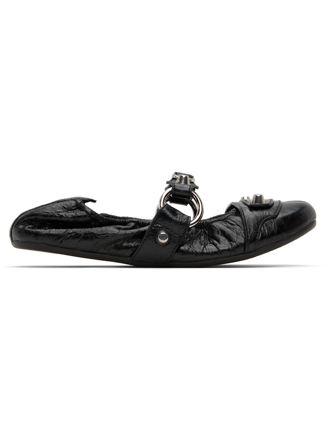 Arena lambskin Mary Jane-style ballerina flats. · Studs and pin-buckle strap at vamp · Elasticized collar · Buffed lambskin lining · Rubber sole Supplier color: Black/Silver Upper: lambskin. Sole: rubber. Made in Italy 251342F118004