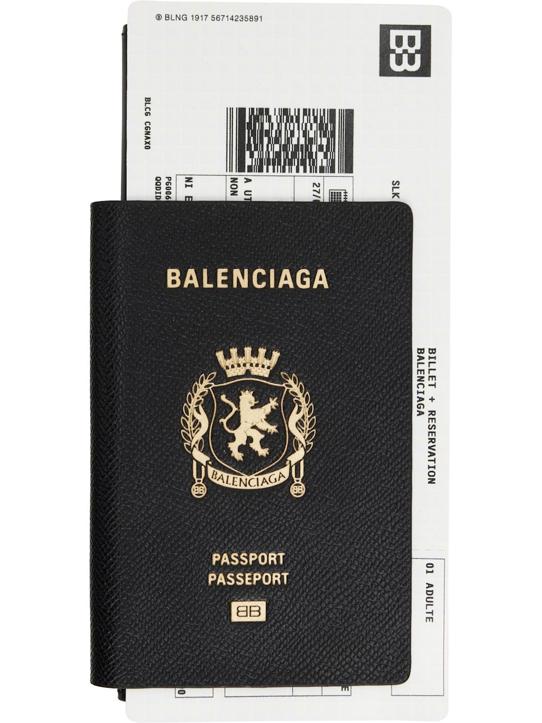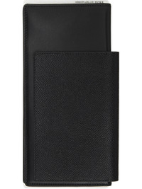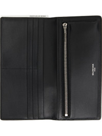 Grained calfskin continental wallet in black. · Gold-tone logo and graphic stamped at face · Trompe l'œil graphic at face · Silver-tone logo stamp at interior · Six card slots · Zip coin compartment · Two note slots · Buffed calfskin interior · Logo-engraved silver-tone hardware · H4" x W7.75" x D0.5" Supplier color: Black Calfskin. Made in Italy 251342M164014