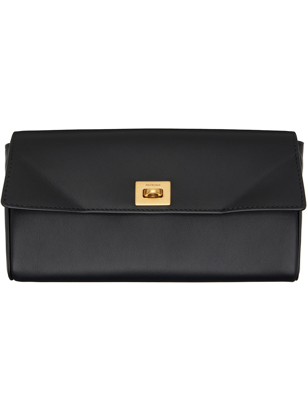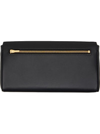 Buffed calfskin continental wallet in black. · Concealed patch pocket at face · Zip pocket at back face · Logo-engraved tab-slot flap · Six card slots at interior · Antiqued gold-tone hardware · H4" x W8" x D1.5" Supplier color: Black Calfskin. Made in Italy 251342F040000
