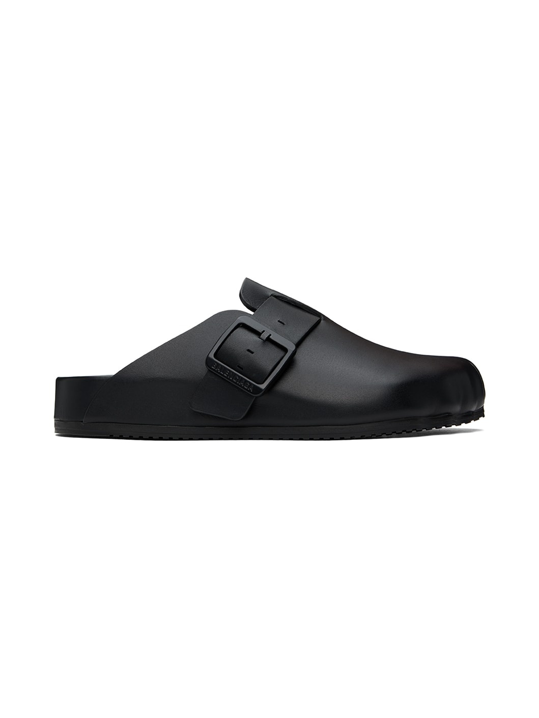 Buffed calfskin slip-on loafers in black. · Molded toe · Pin-buckle strap at vamp · Logo embossed at molded footbed · Treaded rubber sole Supplier color: Black