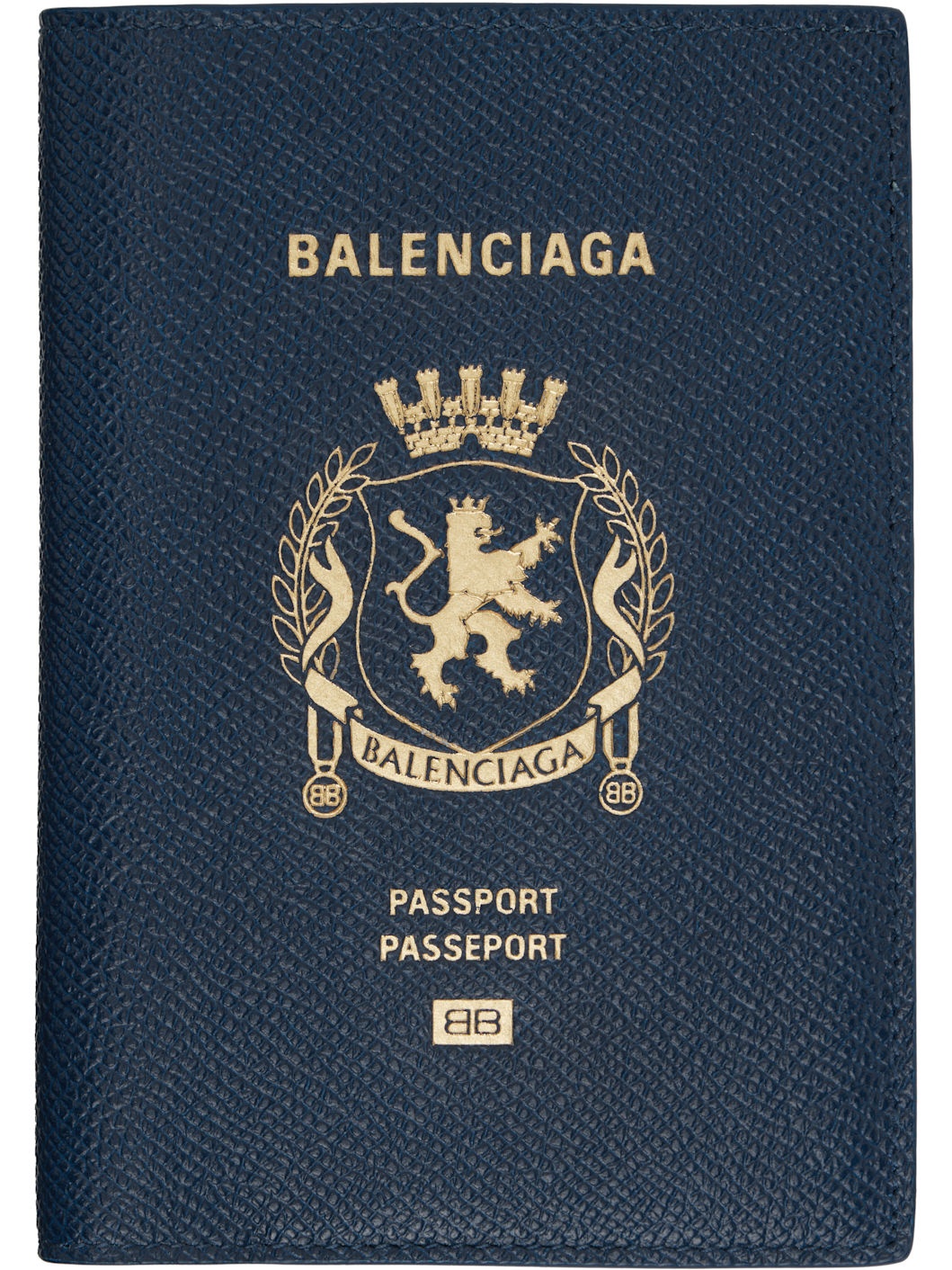 Grained calfskin wallet in blue. · Gold-tone logo and graphic stamp at face · Six card slots · Single passport slot · Buffed calfskin interior · H5.25" x W4" x D0.5" Supplier color: Passport blue Calfskin. Made in Italy 251342F039000