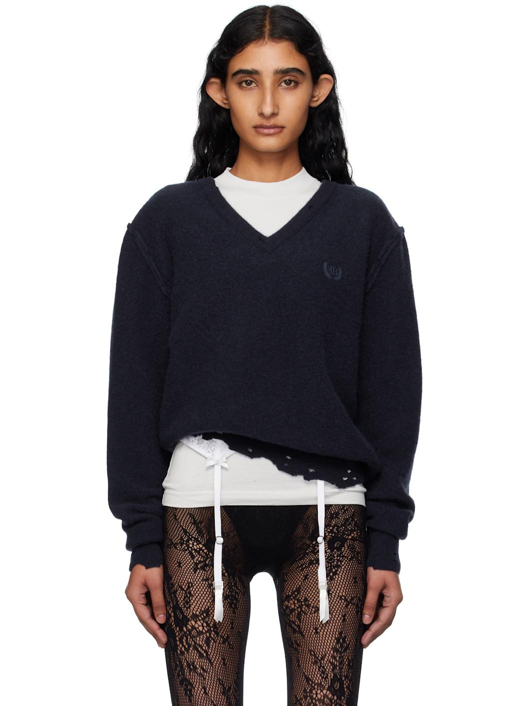 Knit cashmere sweater. · Distressing and exposed seams throughout · Rib-knit V-neck, hem, and cuffs · Logo and graphic embroidered at chest Supplier color: Navy 100% cashmere. Made in Italy 251342F100000
