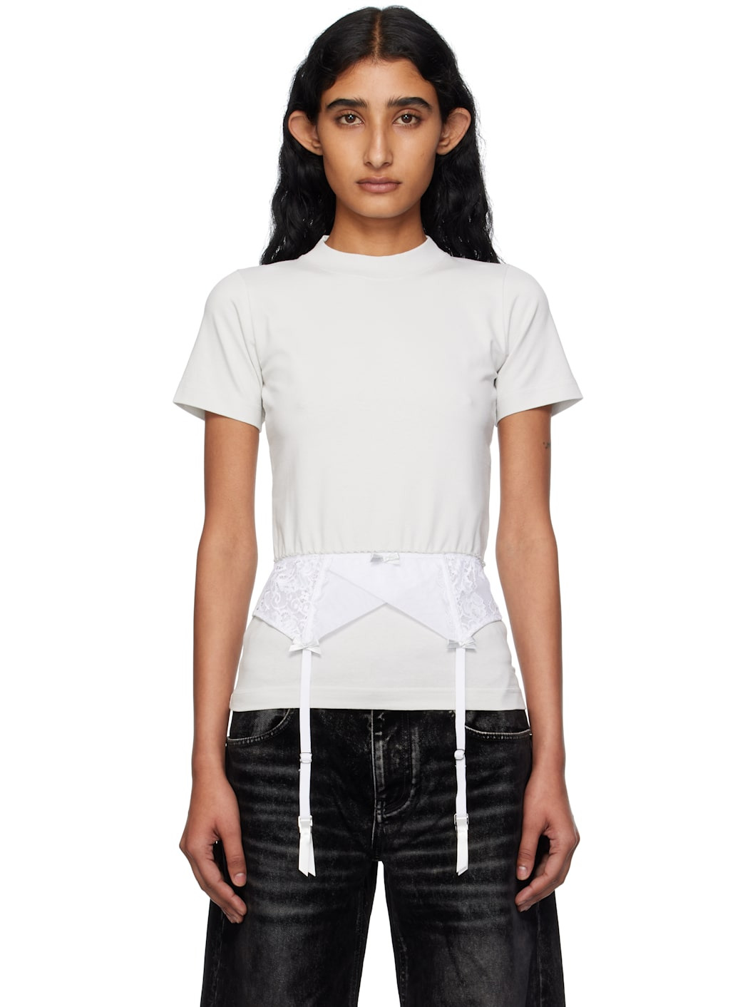 Stretch cotton jersey T-shirt. · Rib-knit crewneck · Mesh and lace garter-style waistband · Garter straps at front and back · Scalloped edges and bow accents Supplier color: Dirty white Body: 95% cotton, 5% elastane. Trim 1: 84% polyamide, 16% elastane. Trim 2: 57% polyamide, 23% viscose, 20% elastane. Trim 3: 92% polyamide, 8% elastane. Made in Portugal 251342F110008