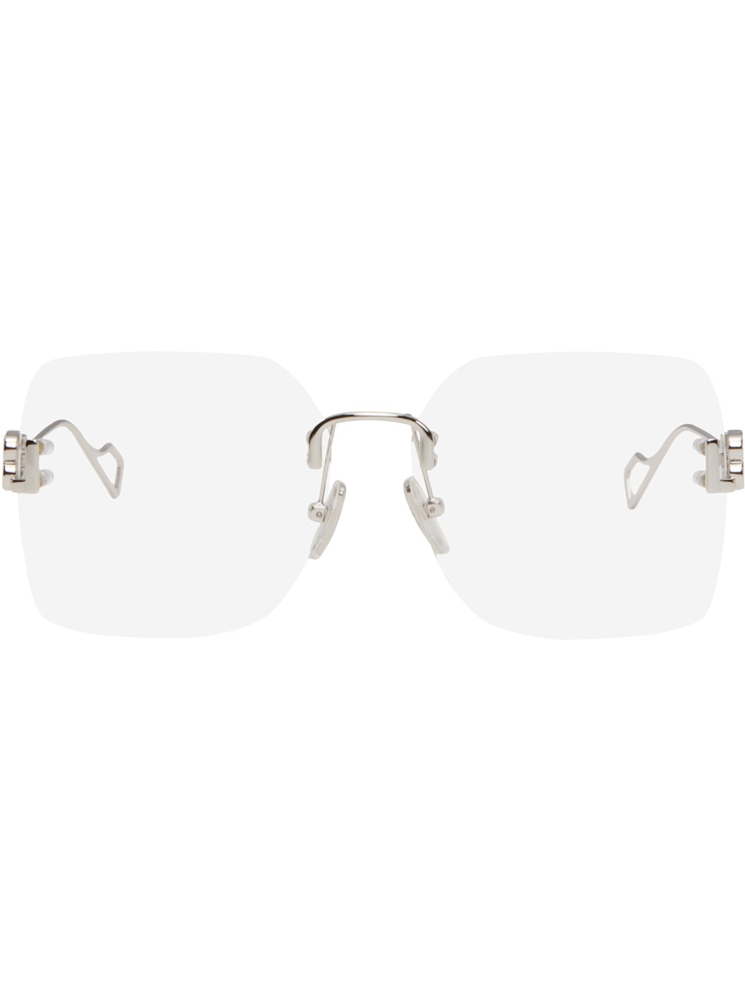 Square rimless metal-frame optical glasses in silver tone. · Adjustable rubber nose pads · Logo hardware at hinges · Eyewear chain compatible · Includes case · Size: 60.15 140 Supplier color: Silver Metal. Made in Italy 252342F004001
