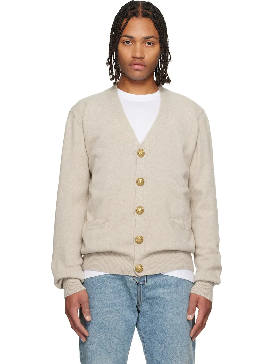 Knit cashmere- and virgin wool-blend cardigan. · Rib-knit Y-neck, hem, and cuffs · Button closure · Patch pockets at front · Dropped shoulders · Logo-engraved gold-tone hardware Supplier color: Beige clair 50% cashmere, 50% virgin wool. Made in France 252251M200000