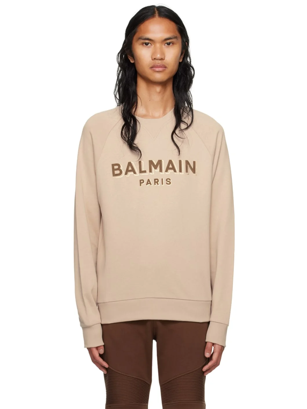 GOTS-certified organic cotton French terry sweatshirt. · Rib knit crewneck, hem, and cuffs · Logo flocked and printed at chest · Raglan sleeves Supplier color: Beige/Taupe/Or