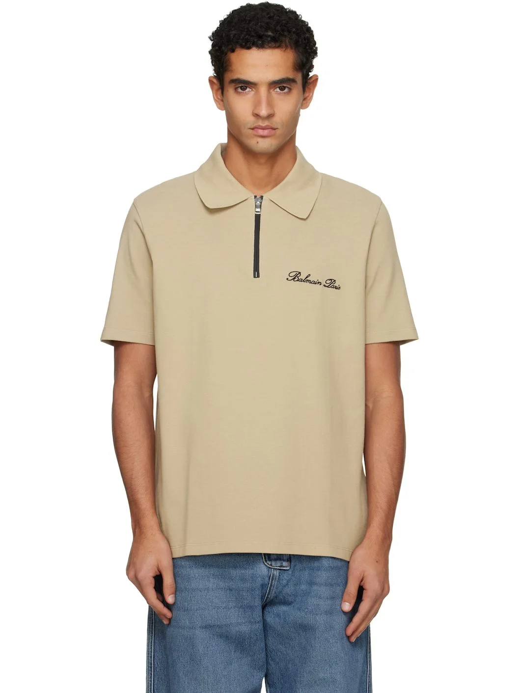 Cotton pique polo. · Rib-knit spread collar · Zip placket · Logo embroidered at chest Supplier color: Camel/Noir 100% cotton. Made in Portugal 252251M212002