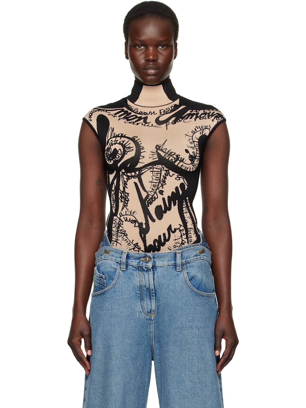 Black & Beige Jacquard Knit Torso Motif Bodysuit