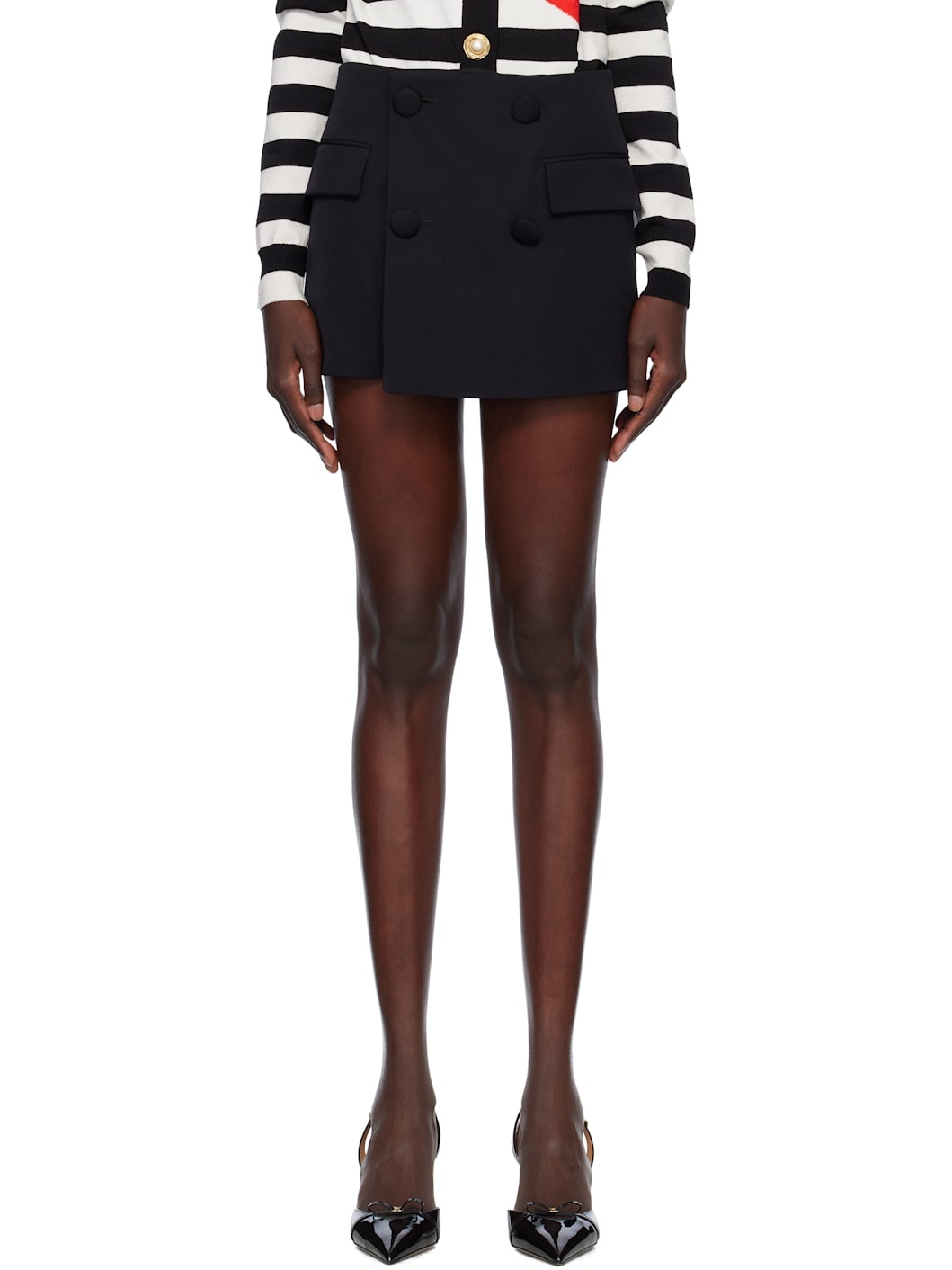 Virgin wool grain de poudre skort. · Wrap construction · Button fastening at waistband · Concealed zip fly · Four-pocket styling · Button hardware at front · Twill pocket lining Supplier color: Noir Body: 100% virgin wool. Lining: 52% viscose, 48% cotton. Made in Slovakia (Slovak Republic) 251251F088001