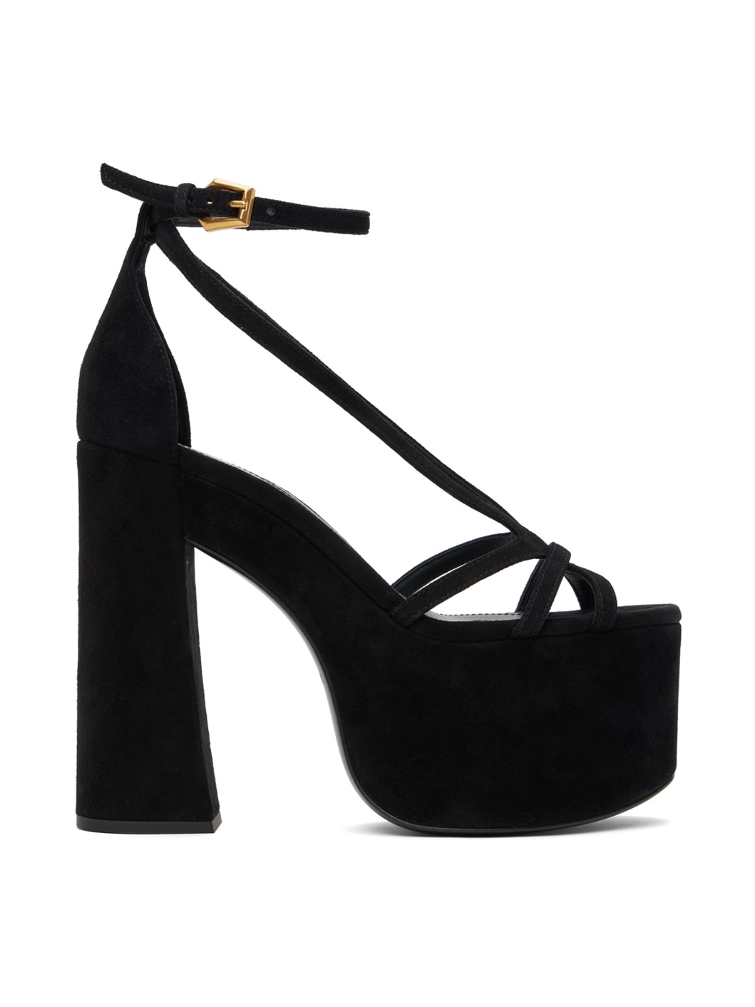 Goatskin suede heeled sandals in black. · Open toe · Straps at vamp · Pin-buckle ankle strap · Logo stamp at buffed leather footbed · Covered platform midsole · Covered block heel with rubber injection · Leather sole · Platform: H2.75" · Heel: H5.25" Supplier color: Noir Upper: goatskin. Sole: rubber, leather. Made in Italy 241251F125000