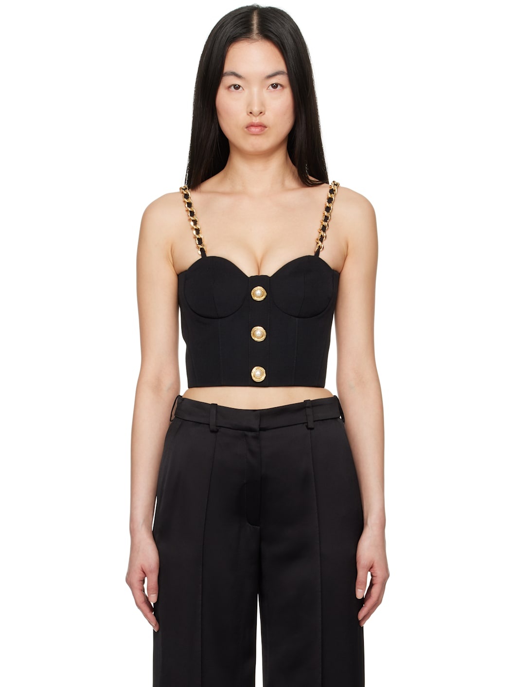 Virgin wool canvas top. · Sweetheart neck · Button hardware with faux-pearl accents · Curb chain detailing at fixed shoulder straps · Zip closure at back · Full sateen lining · Logo-engraved gold-tone hardware Supplier color: Noir Body: 100% virgin wool. Lining: 73% acetate, 27% silk. Made in Slovakia (Slovak Republic) 251251F111014