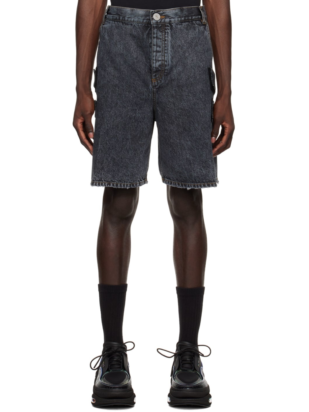 Non-stretch denim shorts. Fading throughout. · Belt loops · Five-pocket styling · Button-fly · Distressing at cuffs · Velcro trim at outseams · Velcro logo patch at back waistband · Contrast stitching in tan throughout Supplier color: Noir delave 100% cotton. Made in Italy 231251M193008