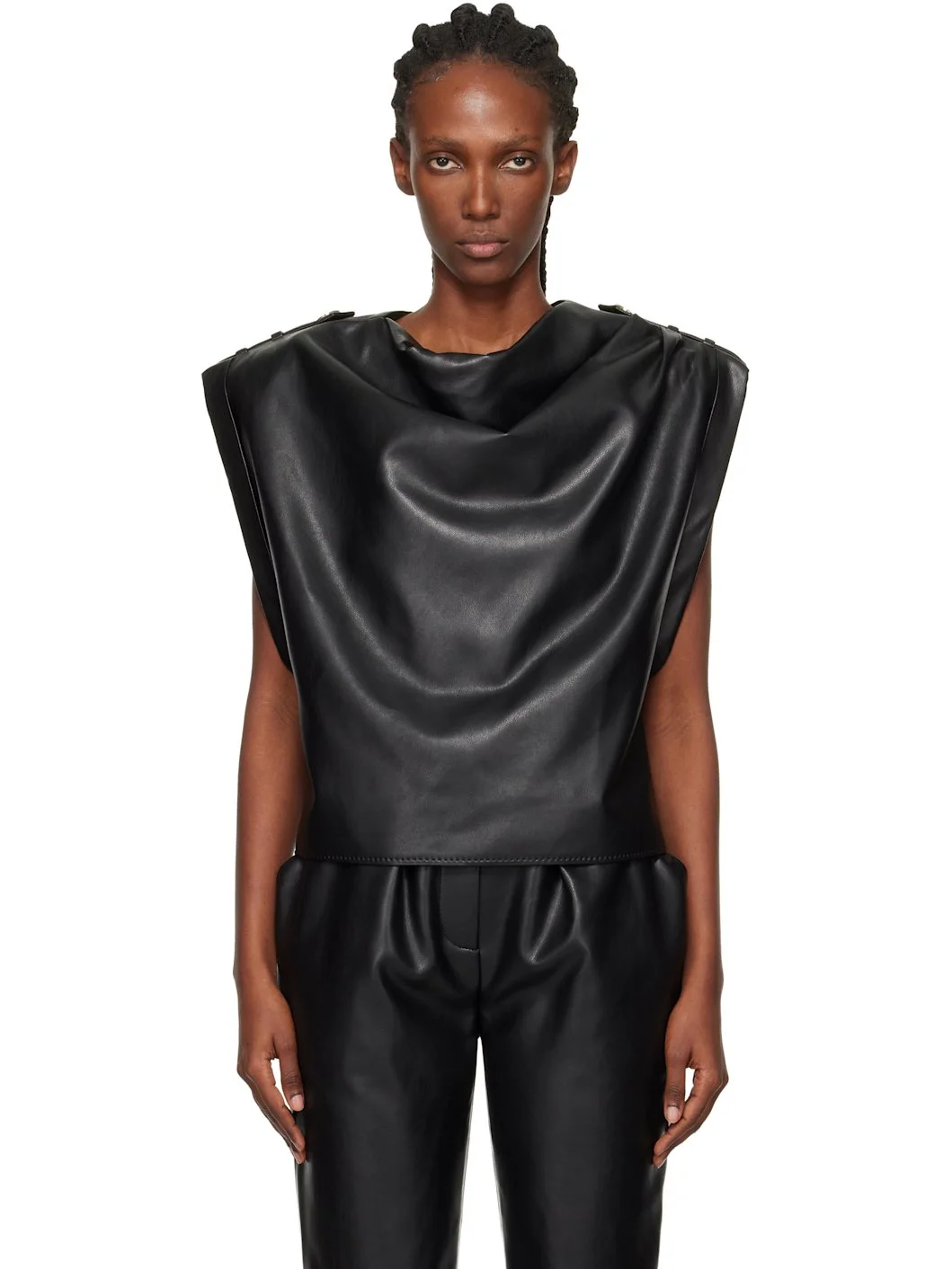 Grained faux-leather top. · Draping throughout · Cowl neck · Epaulets · Padded shoulders · Rolled armscyes · Concealed zip closure at back · Crepe lining Supplier color: Black Body 1: 100% viscose. Body 2: 100% polyurethane. Lining: 73% acetate, 27% silk. Made in Bulgaria 252251F107001