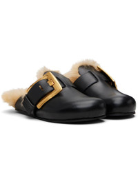 Buffed calfskin slip-on loafers. · Adjustable pin-buckle strap at vamp · Faux-fur lining · Logo-embossed rubber sole · Logo-engraved gold-tone hardware Supplier color: Black Upper: calfskin. Sole: rubber. Made in Italy 252251F121002