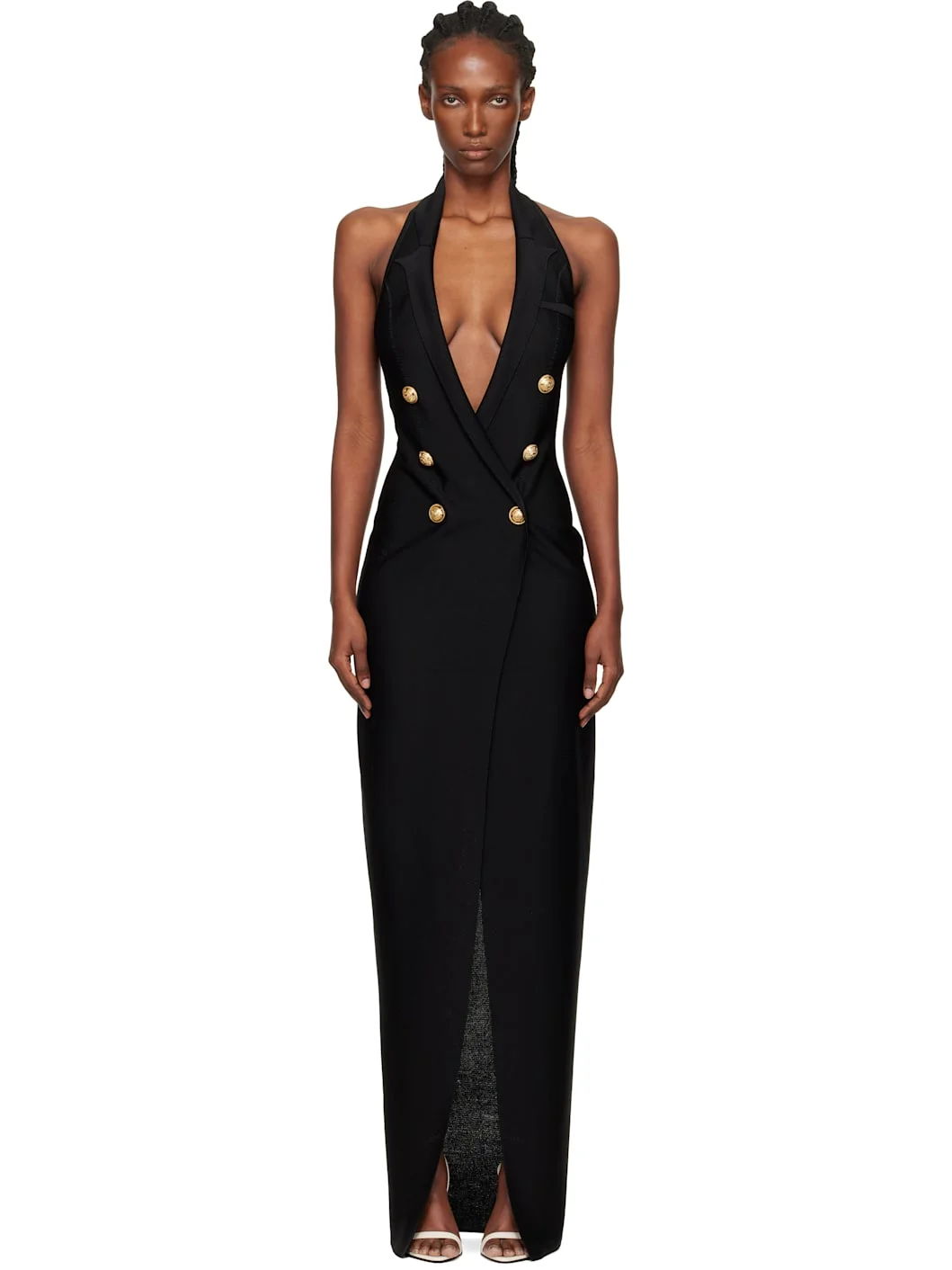 Rib-knit stretch viscose maxi dress. · Peaked lapel · Press-stud closure at halter strap · Double-breasted button closure · Central vent at front · Exposed zip closure at back · Logo-engraved gold-tone hardware Supplier color: Black 98% viscose, 2% elastane. Made in France 252251F055001