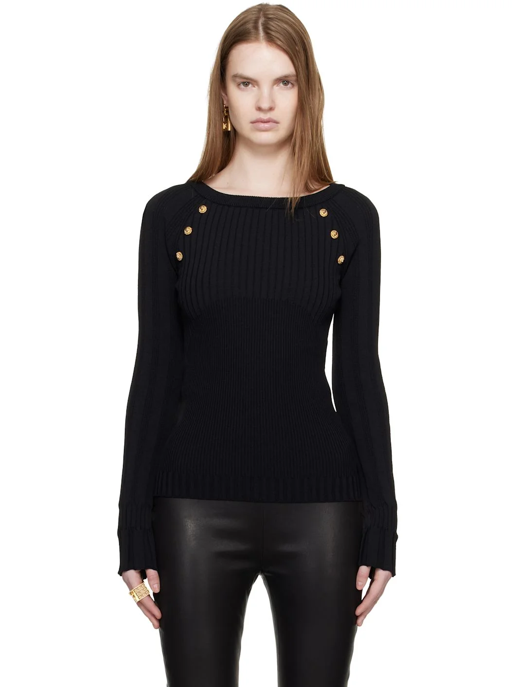Rib-knit viscose-blend sweater. · Boatneck · Mock buttons at front shoulders · Raglan sleeves · Logo-engraved gold-tone hardware Supplier color: Black 75% viscose, 25% polyamide. Made in France 261251F096000