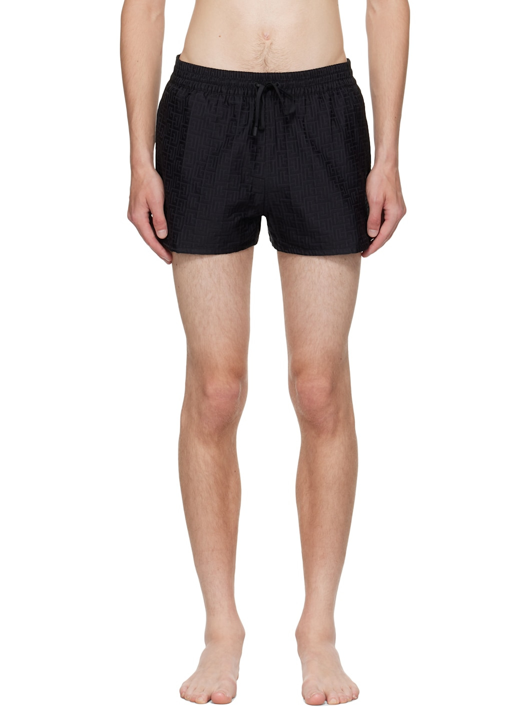 Twill swim shorts. · Jacquard logo graphic pattern throughout · Drawstring at elasticized waistband · Three-pocket styling · Grommets at back waist · Mesh brief-style lining Supplier color: Black Body: 71% polyester, 29% polyamide. Lining: 100% polyester. Made in Italy 252251M208007
