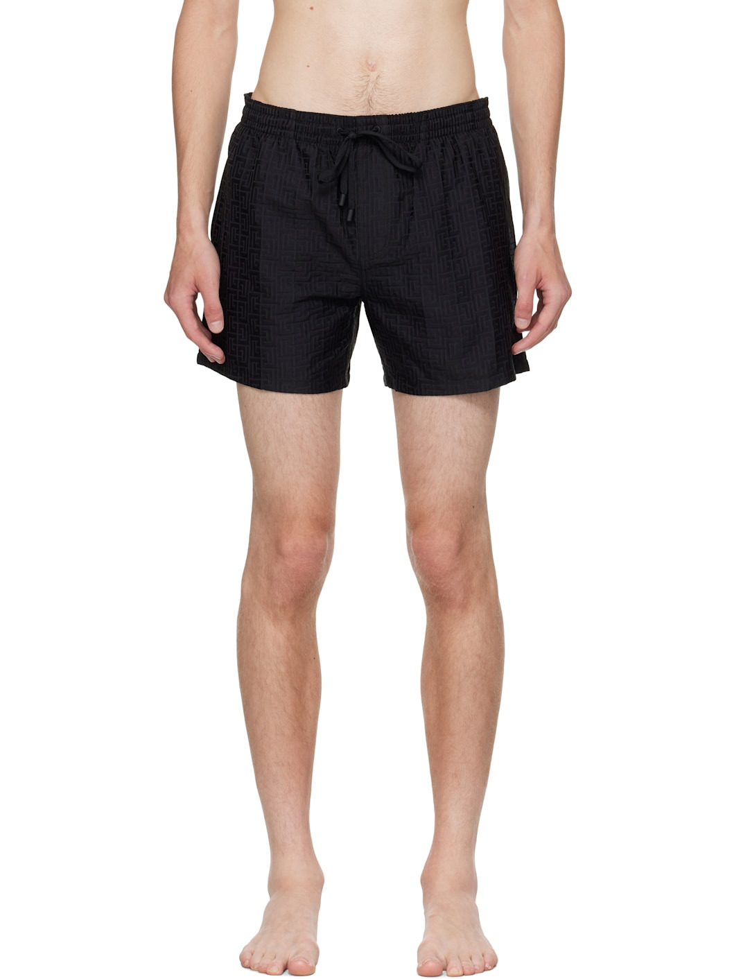 Twill swim shorts. · Jacquard logo graphic pattern throughout · Drawstring at elasticized waistband · Three-pocket styling · Mock fly · Grommets at back waist · Mesh brief-style lining Supplier color: Black Body: 71% polyester, 29% polyamide. Lining: 100% polyester. Made in Italy 251251M208001