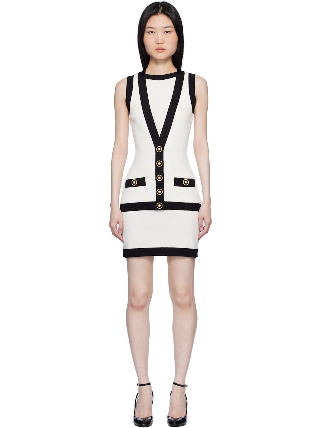 Knit viscose-blend minidress. Integrated vest overlay. · Rib-knit trim throughout · Press-stud closure · Mock welt pockets · Zip closure at back · Graphic-engraved gold-tone hardware Supplier color: Beige 85% viscose, 15% polyester. Made in Italy 251251F052006