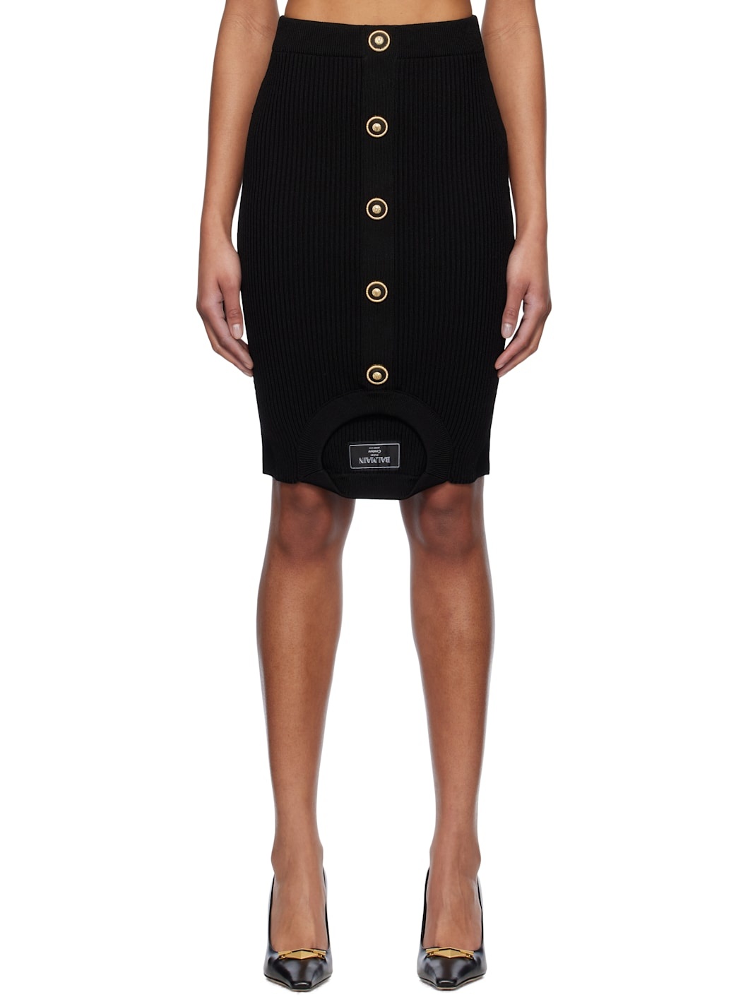 Rib-knit viscose-blend miniskirt. · High-rise · Elasticized waistband · Mock button closure · Crewneck, logo patch, and armscyes at hem · Logo-engraved gold-tone hardware Supplier color: Black 84% viscose, 16% polyester. Made in Italy 251251F090003