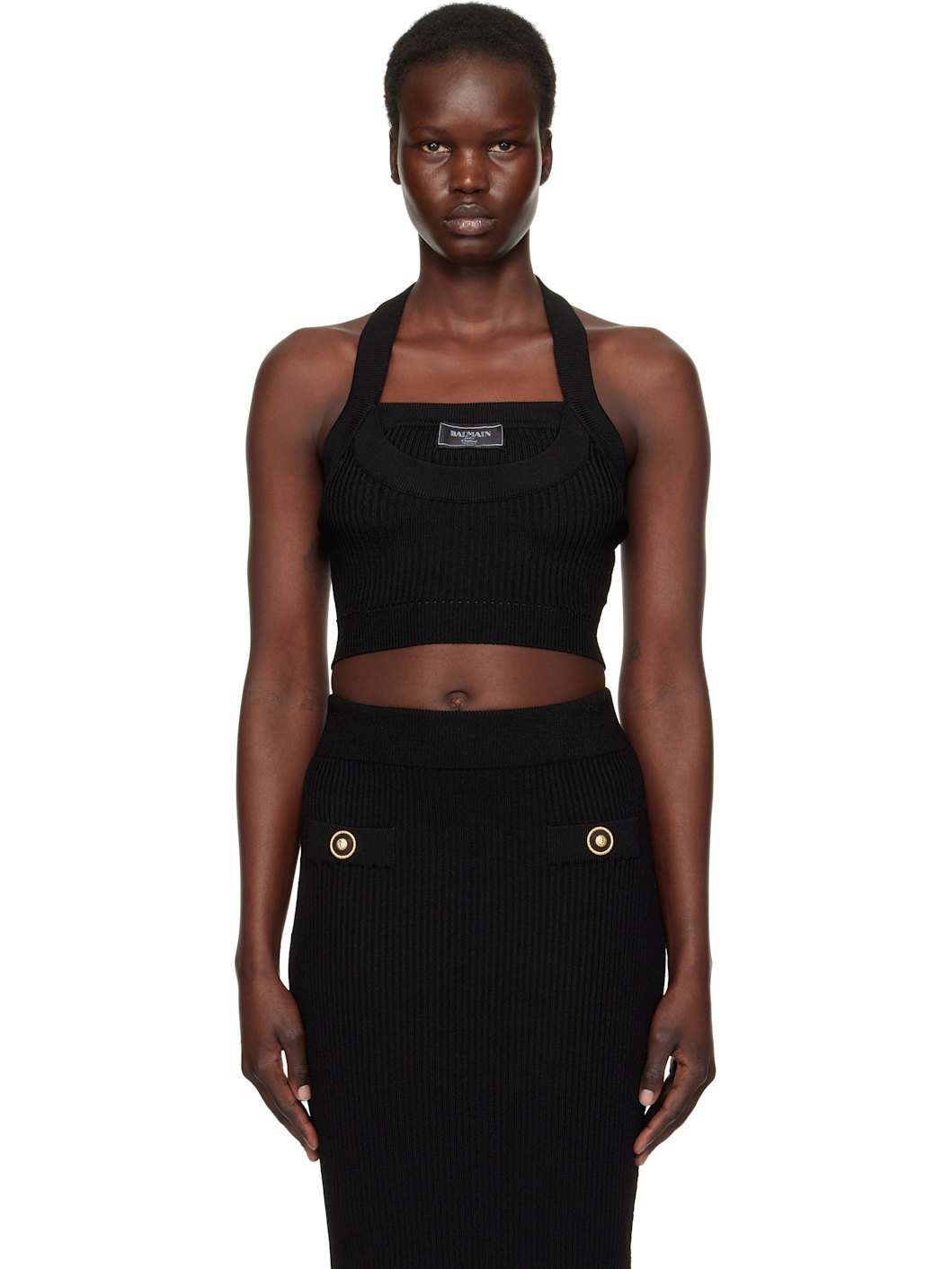 Rib-knit viscose-blend top. · Straight neck · Mock round neck · Logo patch at front · Adjustable press-stud halter strap Supplier color: Black 84% viscose, 16% polyester. Made in Italy 251251F111004