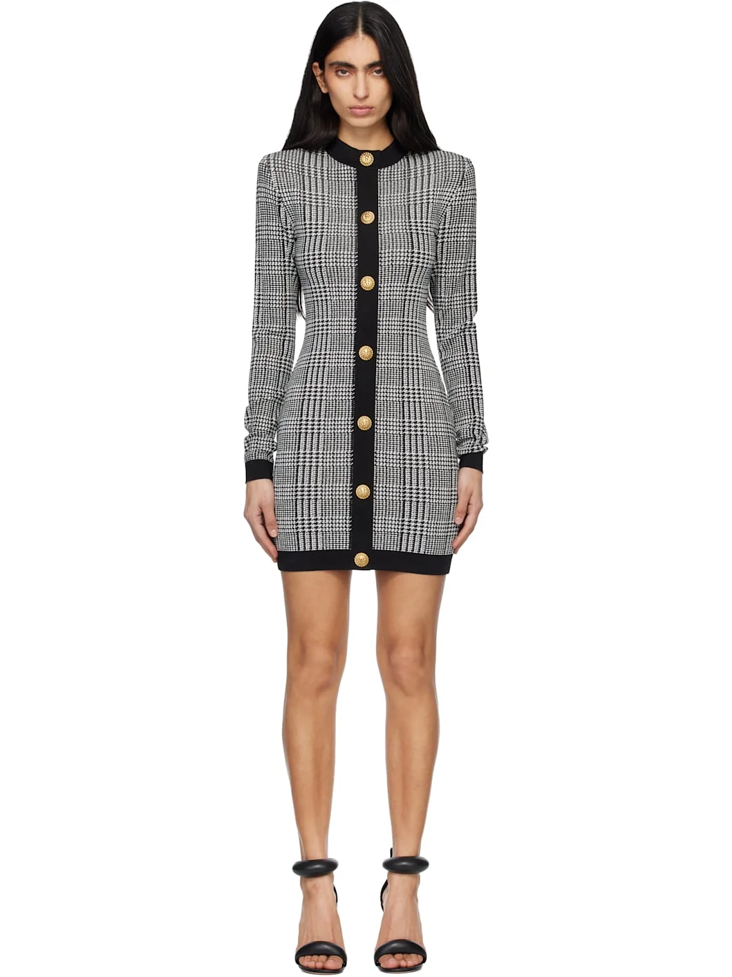 Stretch knit minidress. · Prince of Wales pattern throughout · Rib-knit crewneck, hem, and cuffs · Button detailing at front · Padded shoulders · Zip closure at back · Graphic gold-tone hardware Supplier color: Noir/Naturel Body: 85% viscose, 12% polyester, 2% polyamide, 1% elastane. Trim 1: 83% viscose, 11% polyester, 5% polyamide, 1% elastane. Trim 2: 88% viscose, 12% polyester. Made in France 261251F052005