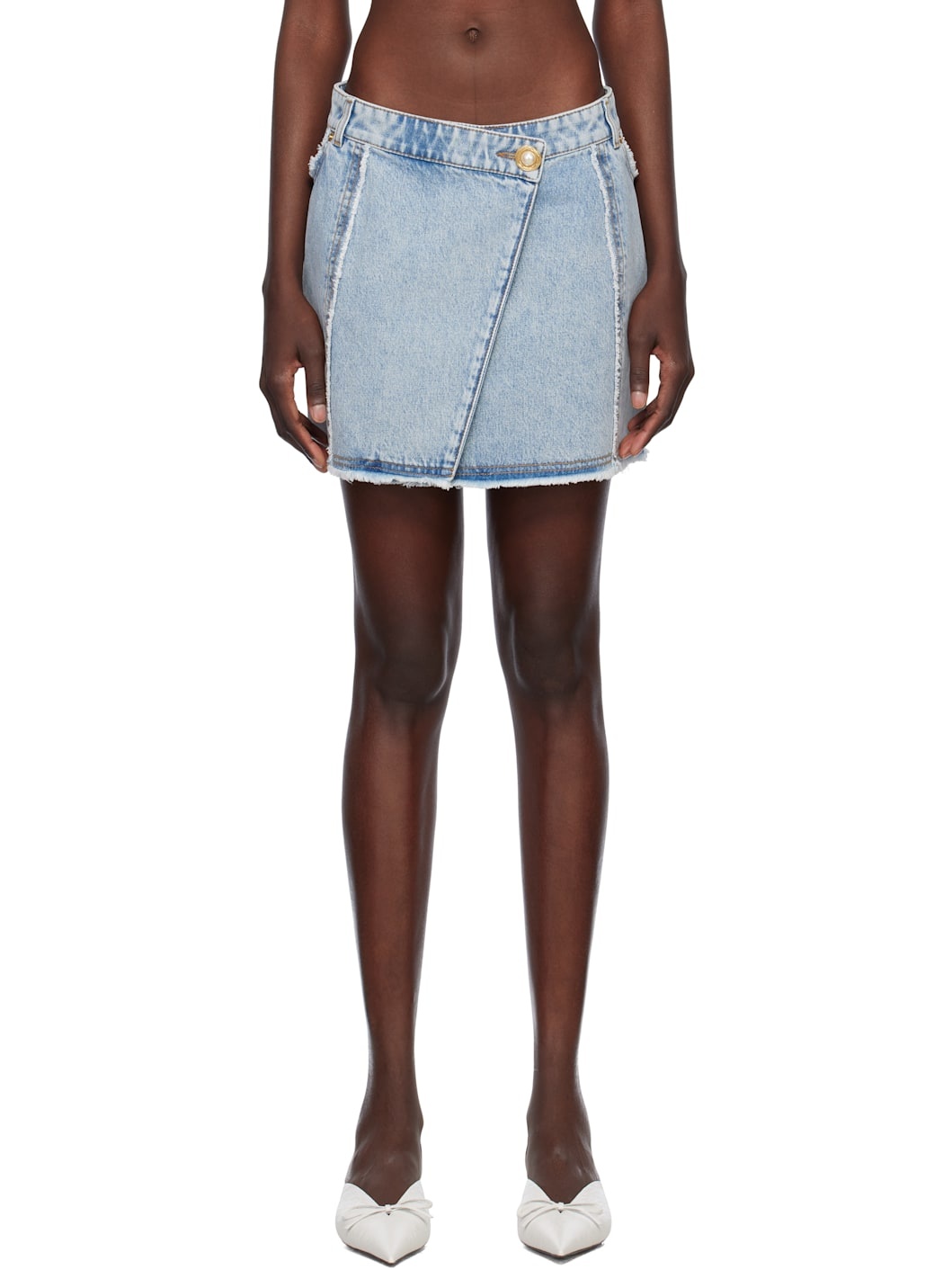Non-stretch denim miniskirt. Fading and raw edges throughout. · Wrap and asymmetrical construction · Belt loops · Press-stud and button fastening at waistband · Four-pocket styling · Logo patch at back waistband · Beaded and sequinned graphic applique at back pocket · Logo-engraved gold-tone hardware · Contrast stitching in tan Supplier color: Blue Body: 100% cotton. Lining: 65% polyester, 35% cotton. Made in Romania 251251F090013