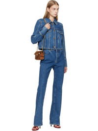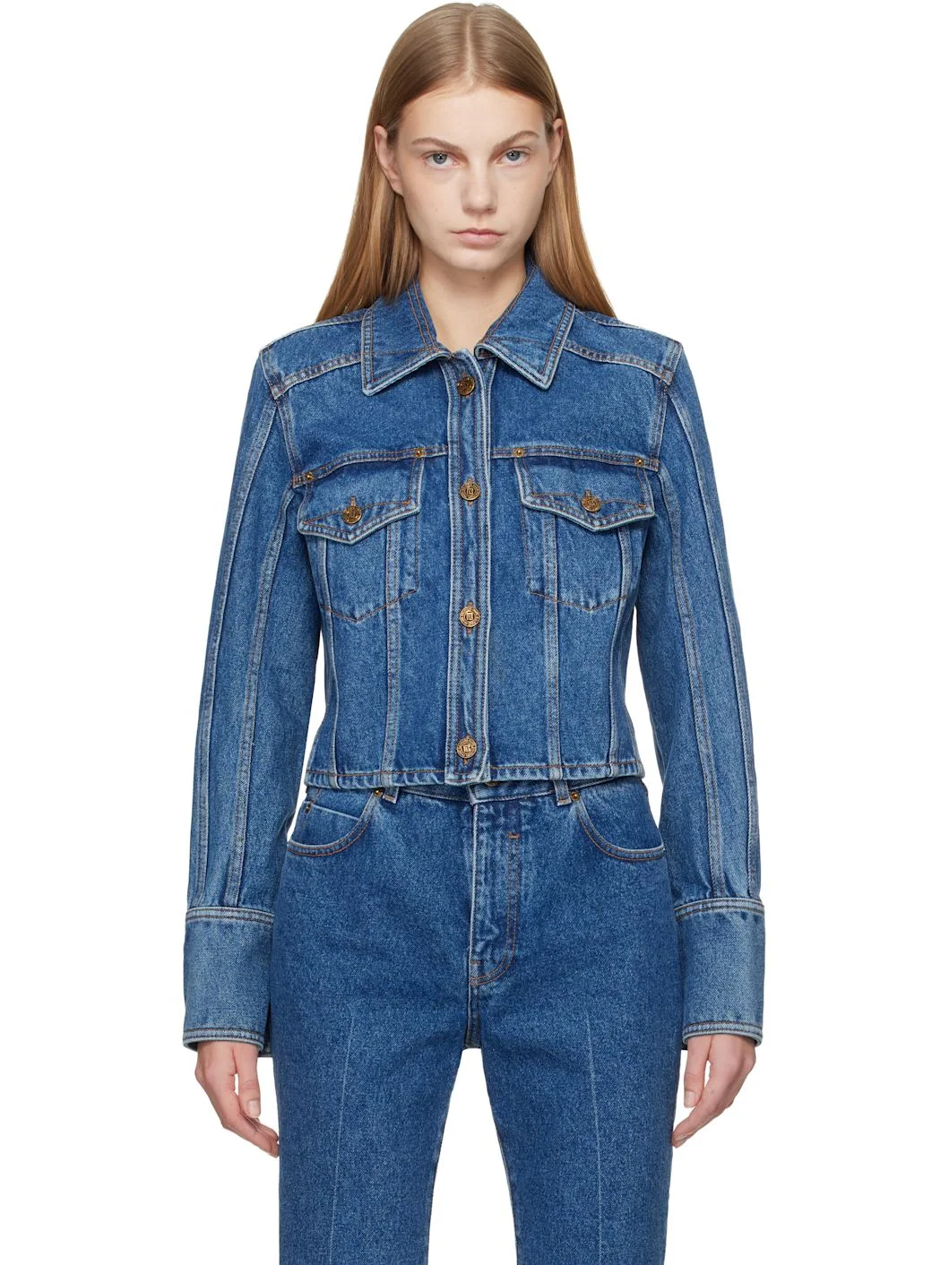Non-stretch organic cotton denim jacket. · Fading throughout · Spread collar · Zip closure · Flap pockets at chest · Cropped hem · Buttoned barrel cuffs · Box pleat at back yoke · Contrast stitching in tan Supplier color: Blue 100% organic cotton. Made in Romania 261251F060000