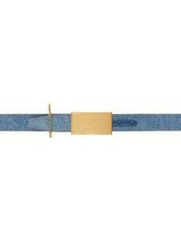 Denim belt in blue. · Safety pin-style keeper loop · Calfskin nubuck interior · Logo plaque at post-stud fastening · Contrast stitching in tan · W1.25" Supplier color: Blue Textile, calfskin. Made in Italy 251251F001001