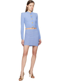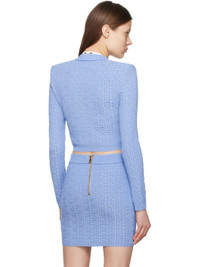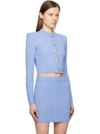 Slim-fit knit viscose-blend cardigan. Metallic thread detailing and jacquard logo pattern throughout. · Rib-knit crewneck, hem, and cuffs · Press-stud closure · Cropped hem · Padded shoulders · Logo-engraved gold-tone hardware Supplier color: Bleu/Bleu brilla Body: 78% viscose, 17% metallic polyester, 5% polyester. Trim: 100% viscose. Made in France 251251F095007