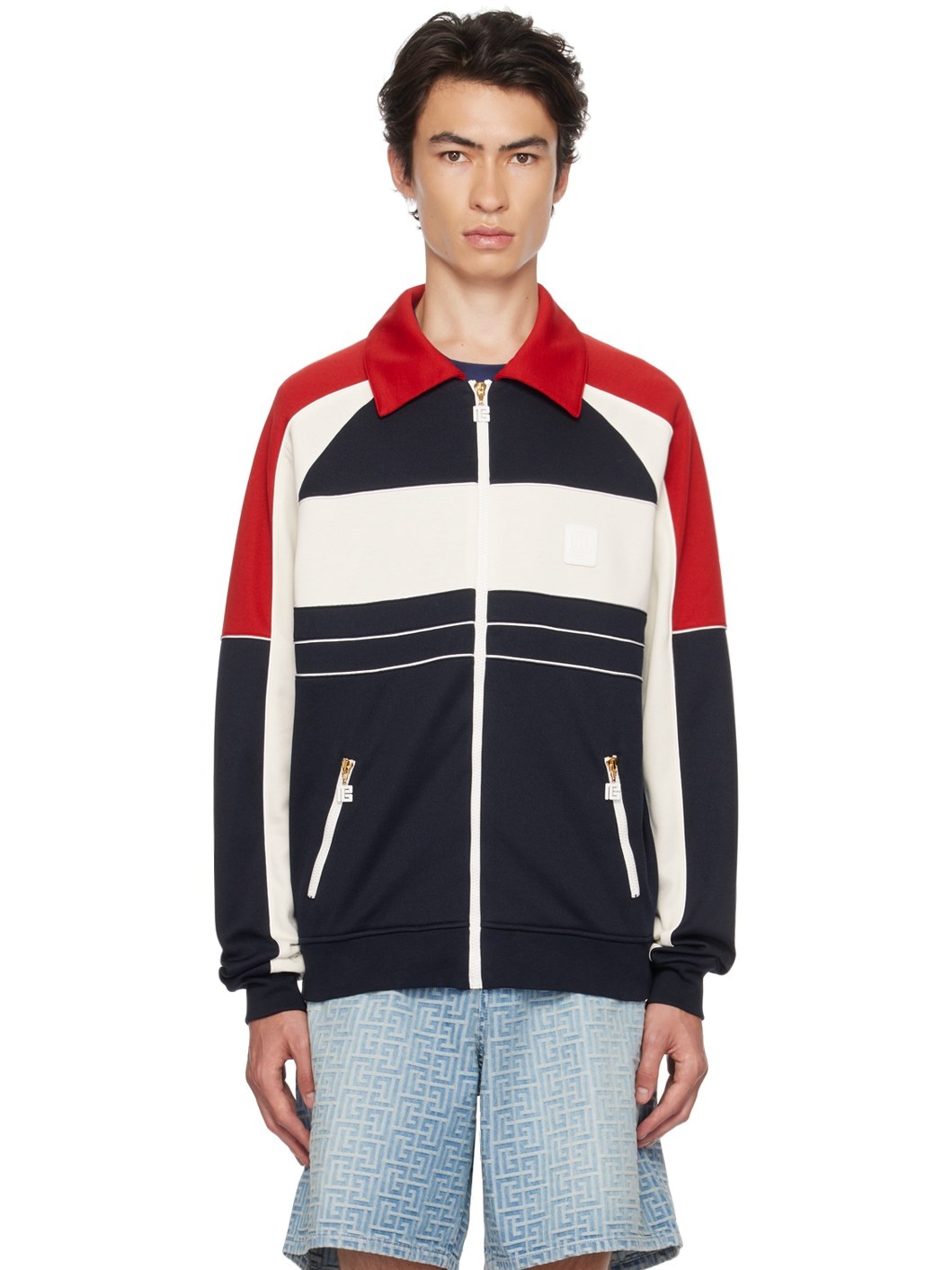 Recycled polyester- and organic cotton-blend twill jacket. Piping throughout. · Paneled construction · Spread collar · Zip closure · Leather logo patch at chest · Zip pockets · Rib knit hem and cuffs · Raglan sleeves · Embroidered logo applique at back · Full cotton jersey lining Supplier color: Bleu marine fonce Body: 55% recycled polyester, 45% organic cotton. Trim: 97% cotton, 3% elastane. Lining: 100% cotton. Made in Italy 232251M180001