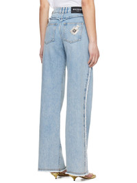 Straight-leg non-stretch denim jeans. Fading, whiskering, and frayed edges throughout. · Belt loops · Five-pocket styling · Zip fly · Satin logo patch at back waistband · Beaded crystal-cut applique at back pocket · Logo-engraved gold-tone hardware · Contrast stitching in tan Supplier color: Blue 100% cotton. Made in Italy 251251F069001