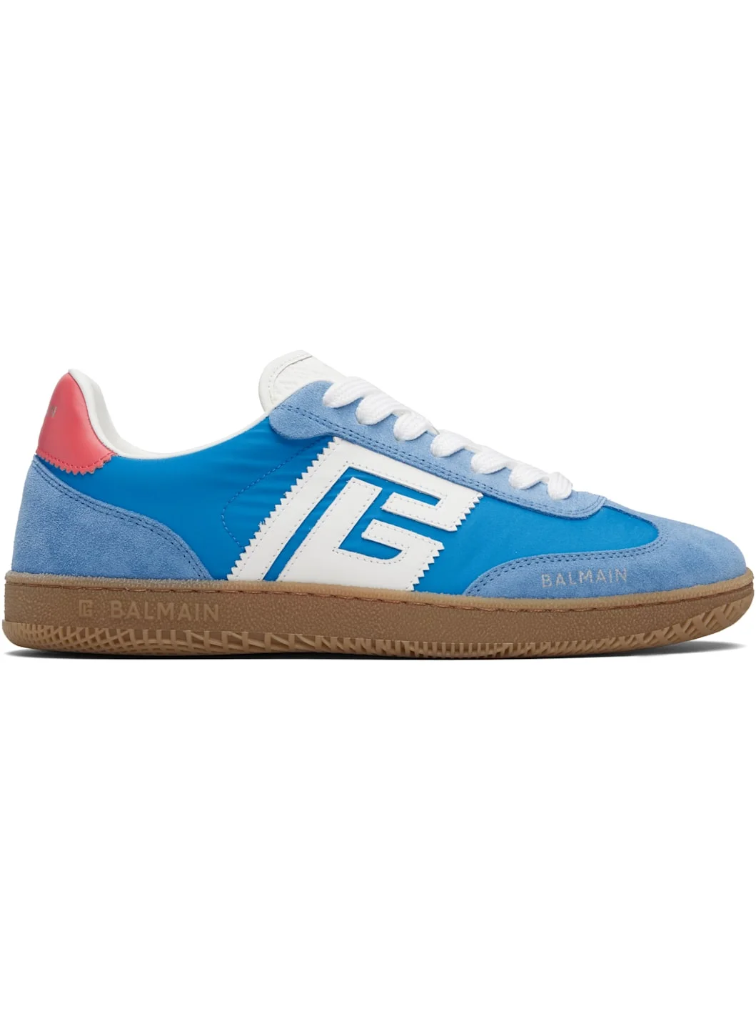 Low-top calfskin suede, taffeta, and buffed calfskin sneakers. · Serrated edges throughout · Lace-up closure · Logo embossed at padded tongue · Padded collar · Logo patch at sides · Logo stamp at outer side and heel tab · Buffed leather lining · Treaded rubber sole Supplier color: Blue Upper: calfskin, textile. Sole: rubber. Made in Italy 252251M237023