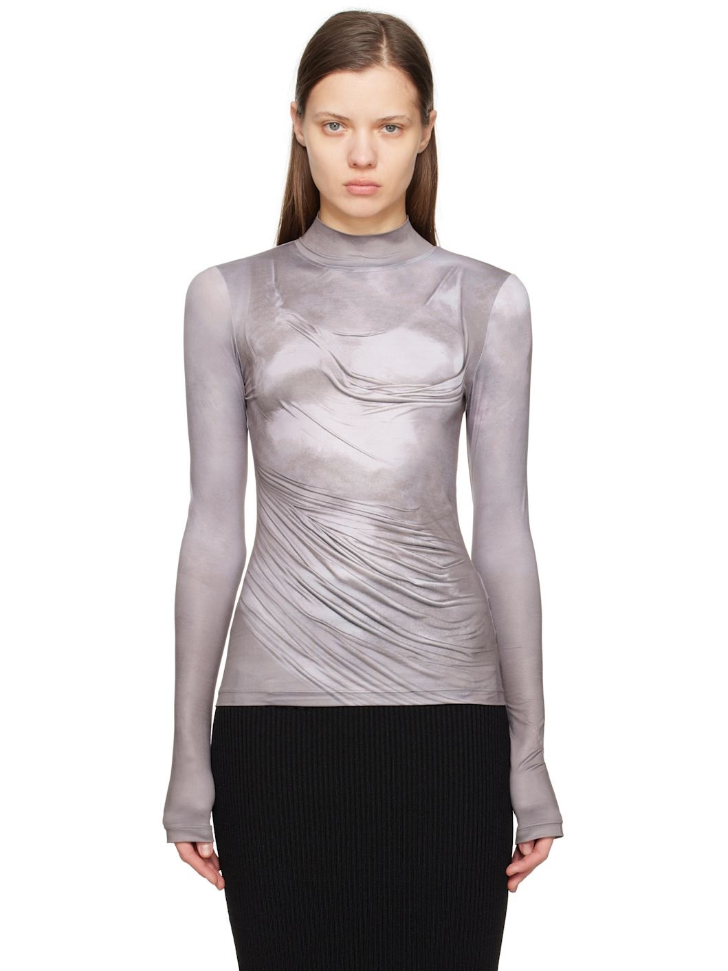 Stretch polyester jersey T-shirt. Trompe l'oeil graphic printed throughout. · Mock neck · Logo patch at back collar Supplier color: Gris fonce 84% polyester, 16% elastane. Made in Bulgaria 251251F110003
