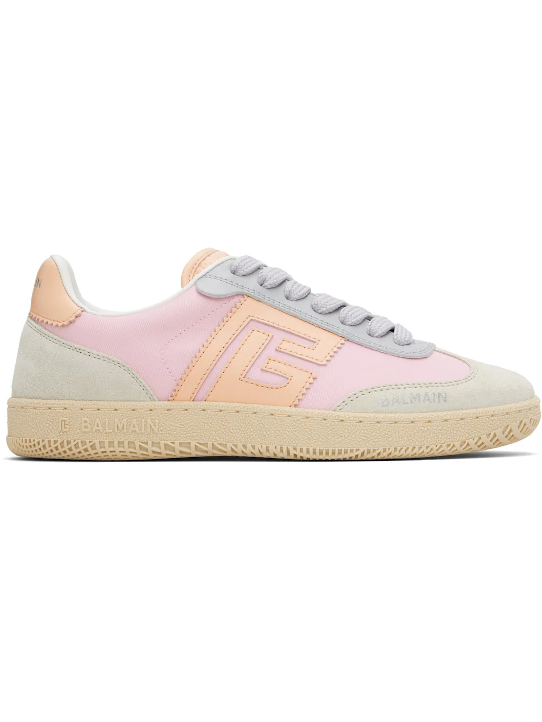 Low-top calfskin suede, taffeta, and buffed calfskin sneakers. · Serrated edges throughout · Lace-up closure · Logo stamp at padded tongue · Padded collar · Logo patch at sides · Logo stamp at outer side and heel tab · Buffed leather lining · Treaded rubber sole Supplier color: Multicolor Upper: calfskin, textile. Sole: rubber. Made in Italy 252251F128005