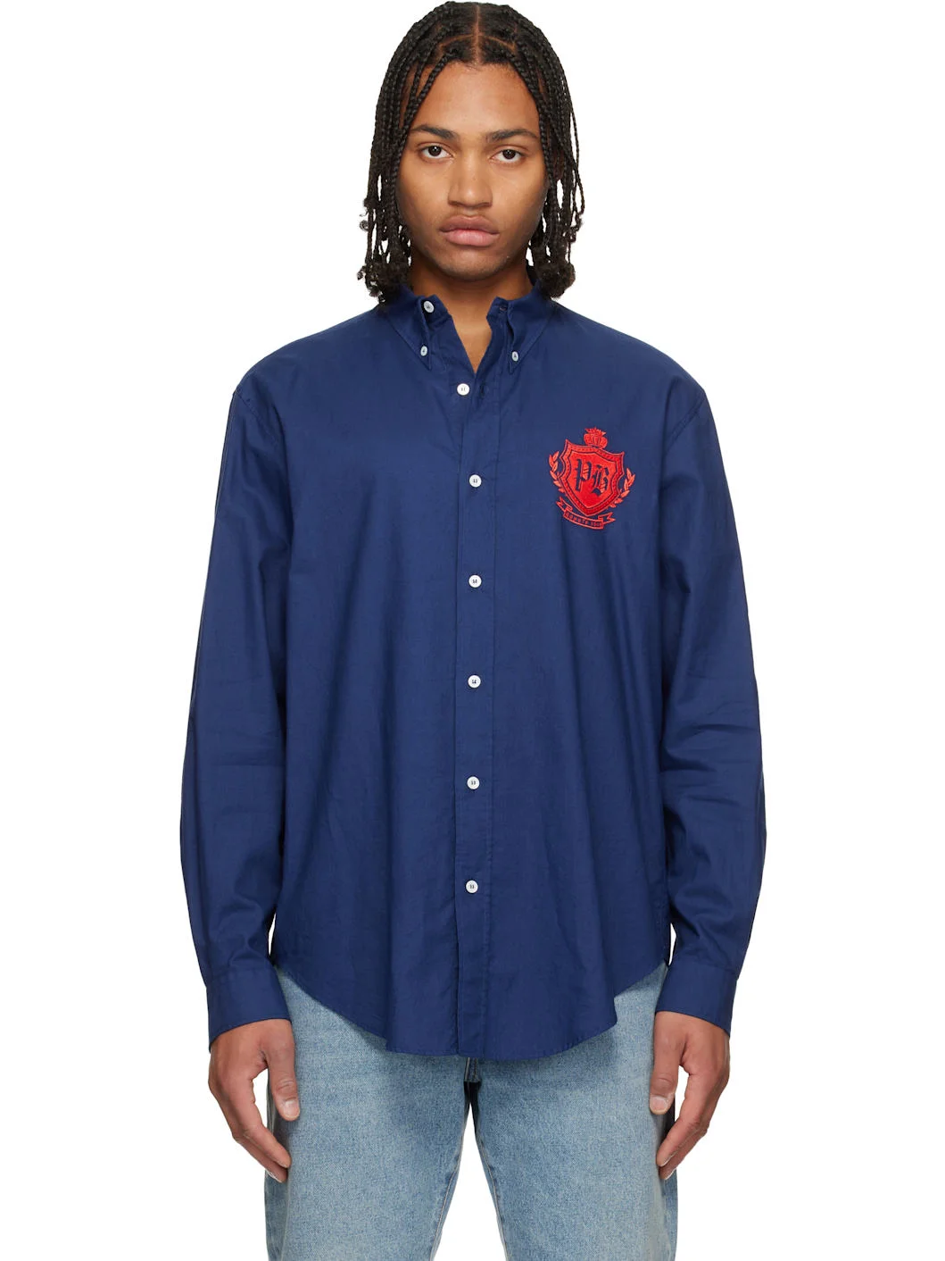 Cotton oxford cloth shirt. · Button-down spread collar · Button closure · Logo graphic embroidered at chest · Shirttail hem · Buttoned barrel cuffs · Logo embroidered at back collar · Box pleat at back yoke Supplier color: Navy 100% cotton. Made in Italy 252251M192013