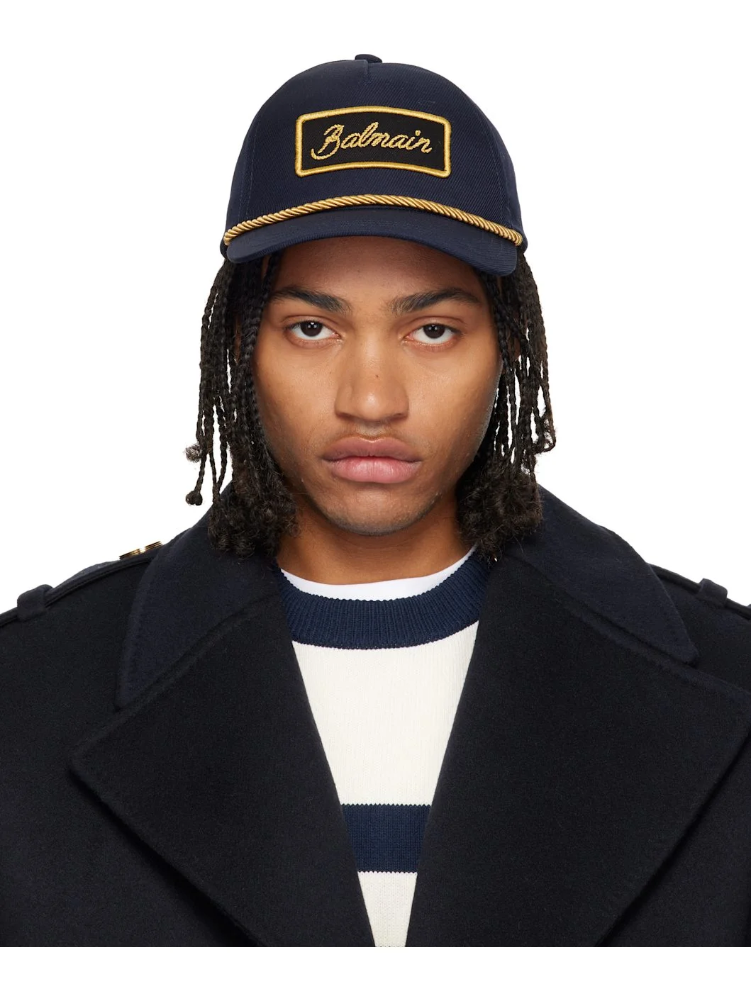Virgin wool twill cap. · Logo embroidered at face · Braided cord detailing at curved brim · Logo-engraved cinch fastening at back face · Twill browband · Plain-woven lining Supplier color: Navy Body: 100% virgin wool. Lining: 80% polyester, 20% cotton. Made in Bulgaria 252251M139003