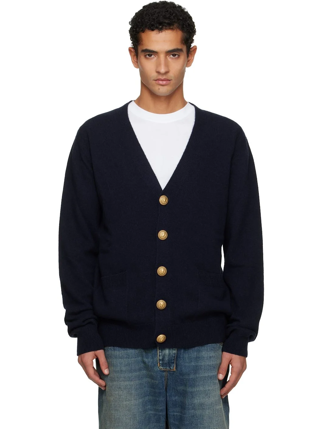 Knit cashmere- and virgin wool-blend cardigan. · Rib-knit Y-neck, hem, and cuffs · Button closure · Patch pockets at front · Dropped shoulders · Logo-engraved gold-tone hardware Supplier color: Navy 50% cashmere, 50% virgin wool. Made in France 252251M200001