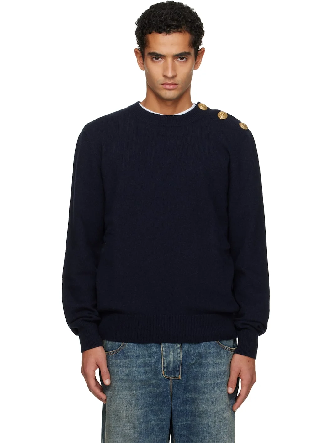 Knit cashmere- and virgin wool-blend sweater. · Rib-knit crewneck, hem, and cuffs · Press-stud hardware at shoulder · Logo-engraved gold-tone hardware Supplier color: Navy 50% cashmere, 50% virgin wool. Made in France 252251M201002