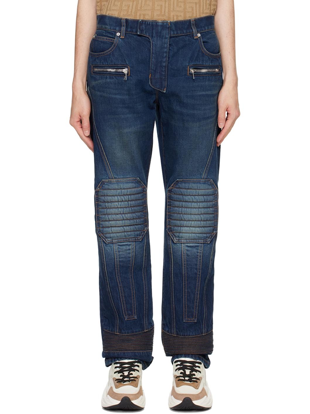 Straight-leg non-stretch denim jeans. Fading, whiskering, and quilted panels throughout. · Paneled construction · Belt loops · Seven-pocket styling · Zip-fly · Logo patch at back waistband · Silver-tone hardware · Contrast stitching in tan Supplier color: Navy Body: 100% cotton. Lining: 65% polyester, 35% cotton. Made in Italy 242251M186014