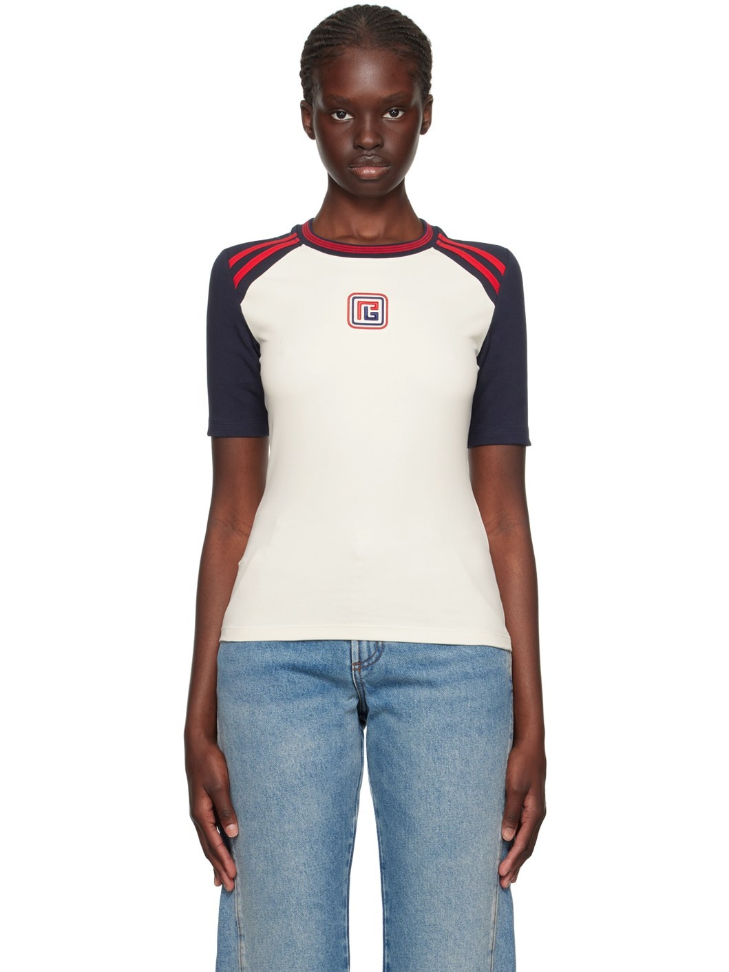 Paneled stretch cotton jersey T-shirt. · Striped rib knit crewneck · Logo embroidered at chest · Raglan sleeves Supplier color: Cream/Marine/Red Body: 95% cotton, 5% elastane. Trim: 96% cotton, 4% elastane. Made in Portugal 241251F110000